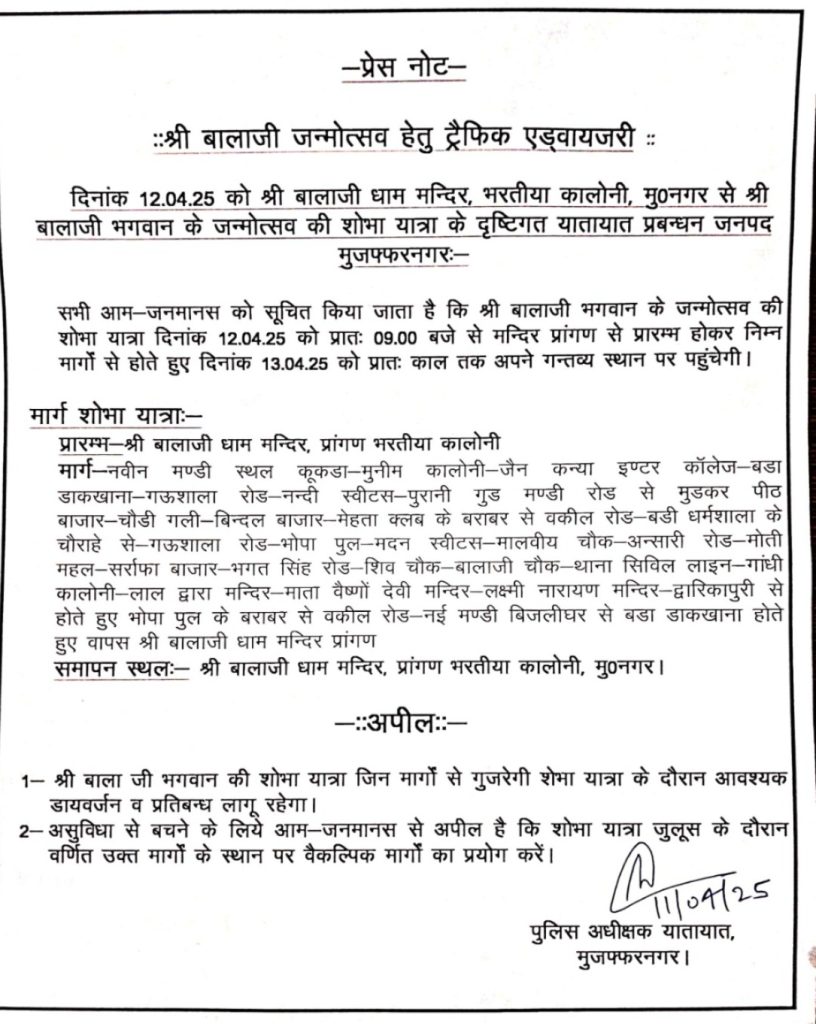 अवगत कराना है दिनांक 12.04.2025 को श्री बालाजी जन्मोत्सव की शोभायात्रा के दृष्टिगत मुजफ्फरनगर पुलिस द्वारा निम्न ट्रैफिक एडवायजरी जारी की जाती है।