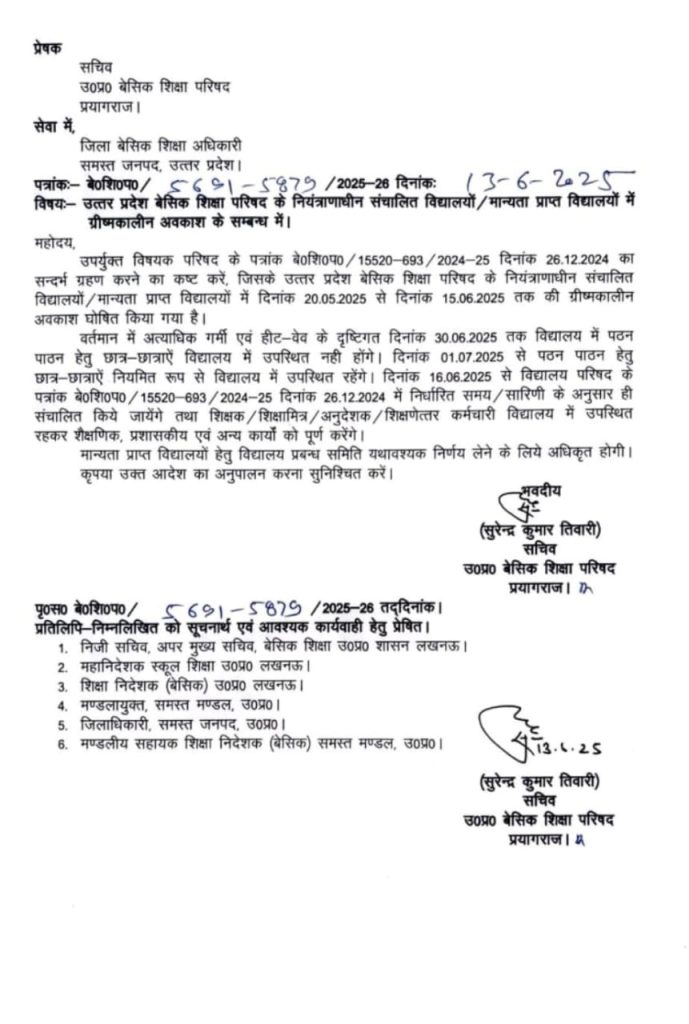 बढ़ती गर्मी, हीटवेव और बच्चों में बीमारियों के बढ़ते मामलों के बाद यूपी बेसिक शिक्षा परिषद ने आदेश जारी किया।