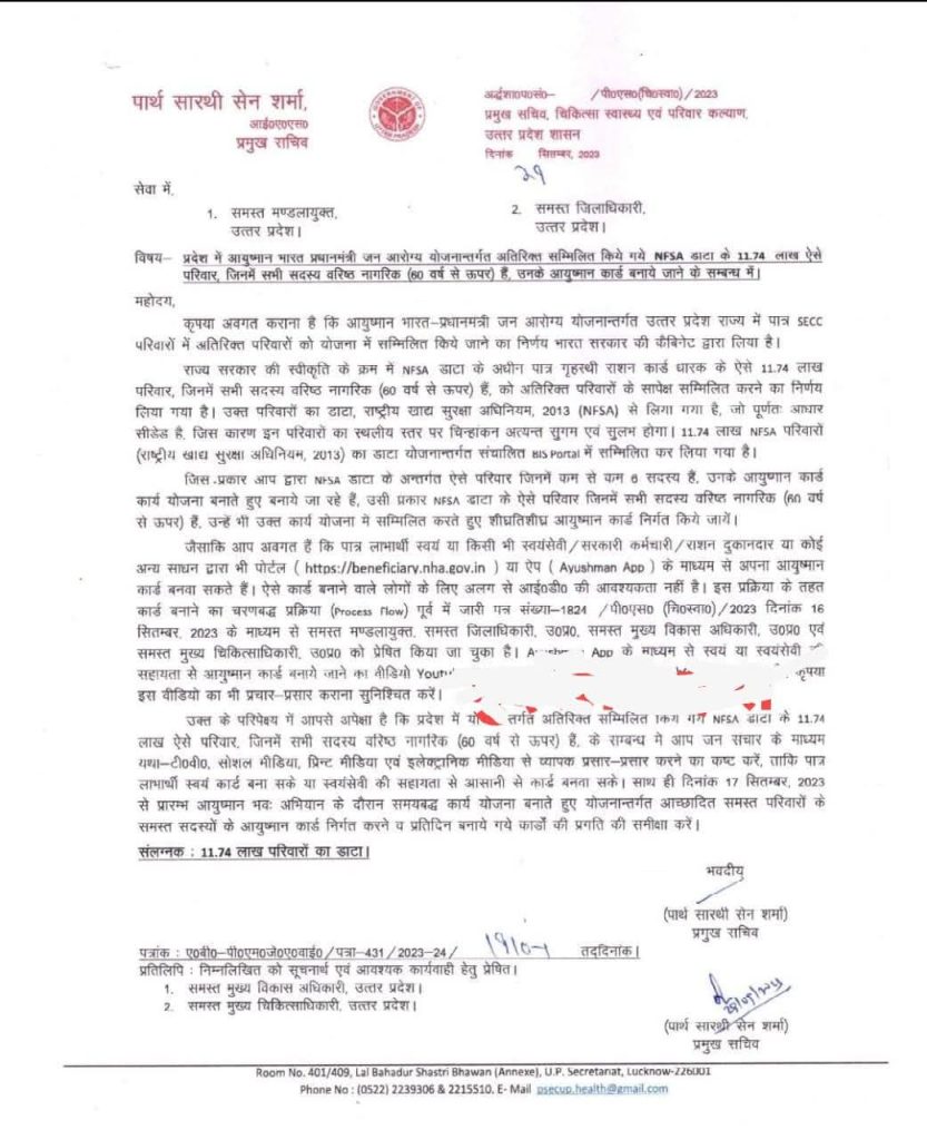 ‼️यूपी में अब सभी 60 वर्ष से ऊपर हो चुके व्यक्ति के बनेंगे आयुष्मान कार्ड,प्रमुख सचिव ने सभी जिलाधिकारी को जारी किया आदेश‼️