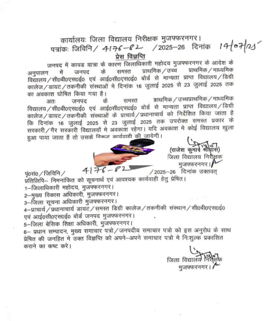 मुजफ्फरनगर दिनांक 14 जुलाई 2025 जिला विद्यालय निरीक्षक राजेश कुमार ने बताया कि कावड यात्रा के दृष्टिगत जिलाधिकारी श्री उमेश मिश्रा के आदेश क्रम में जनपद के प्राथमिक/उच्च प्राथमिक/ माध्यमिक समस्त विद्यालय / सी०बी०एस०ई० एवं आई०सी०एस०ई० बोर्ड से मान्यता प्राप्त विद्यालय/डिग्री कालेज / डायट / तकनीकी संस्थाओं मे दिनांक 16 जुलाई 2025 से 23 जुलाई 2025 तक का अवकाश घोषित किया गया है।